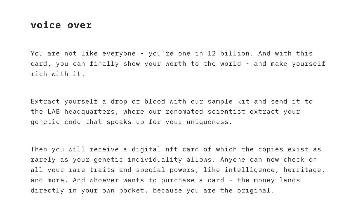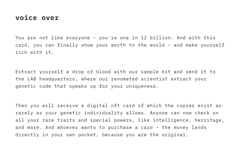 Das Voice-Over bzw das "written story board" dient zur Veranschaulichung der Szenen und zeigt den Flow der späteren Animation im Konzeptionsstadium des Projektes. So stellen wir sicher, dass die Botschaft genau deine Erwartungen trifft, und vermeiden teure sowie komplizierte Änderungen im späteren Verlauf.